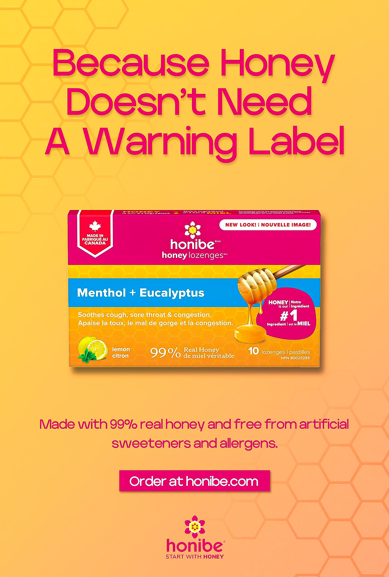 Outshined by brands like Halls and Ricola, Honibe is a small Canadian lozenges and vitamin brand trying to stand out with its unique selling point: soothing symptoms with real honey.Many people don't know how many medicinal ingredients go into most cough drops. And yes, they do have warning labels for it. So next time you have a sore throat, why not try something natural instead?